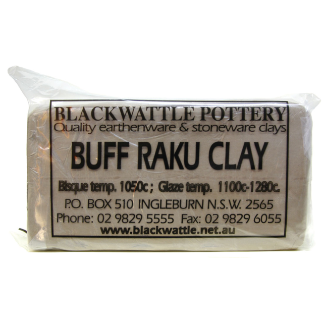 Blackwattle Buff Raku: A good all round clay. Suitable for wheel work and hand building. It has good plasticity with enough fine Grog (0.5mm) for slab work etc. Fires buff to brown depending on temperature and kiln atmosphere. Can be fired to stoneware temperatures. Bisque 05 (10500 C) Glaze 06-10 (1000-12500C).